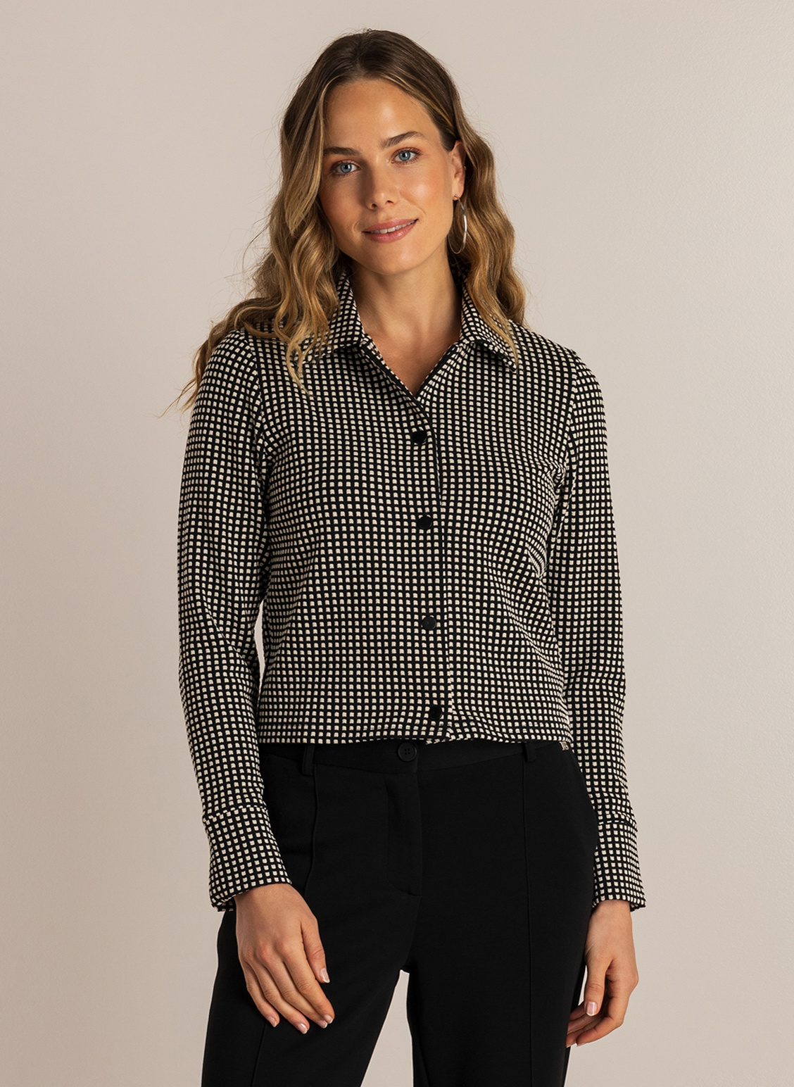 - Pasvorm : licht getailleerd, drukknoopsluiting