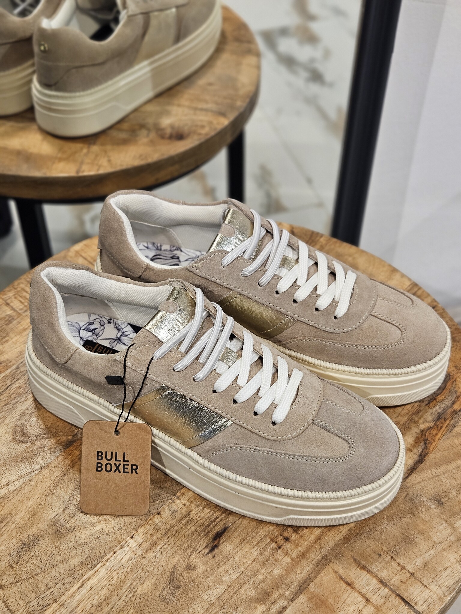 ProductomschrijvingMateriaal : suédeKleur : zandMerk : BullboxerSluiting : vetersValt : op maatHak hoogte : -Model : sneakersVoetbed : los