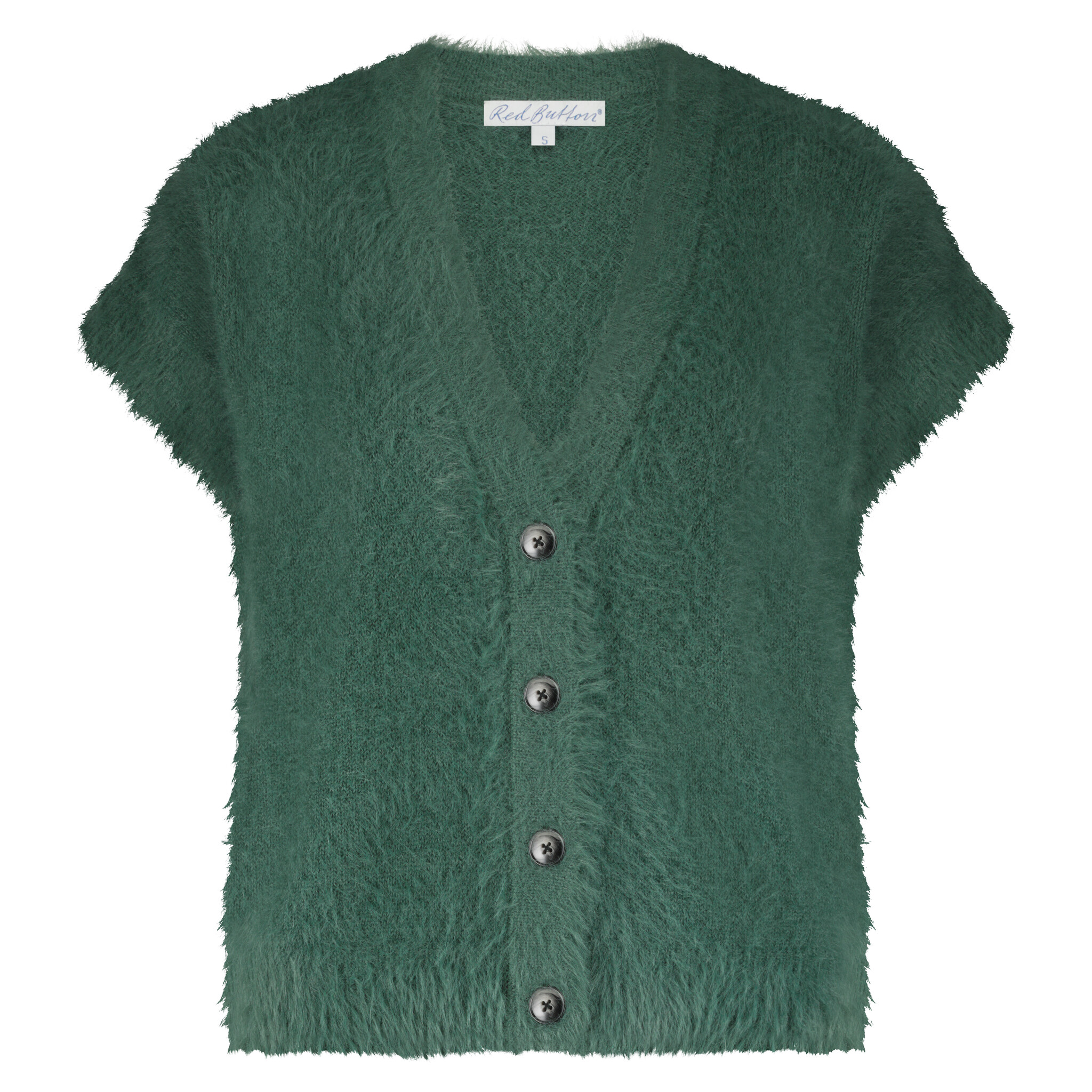 - Pasvorm : rechtvallend, langharige zacht gebreide stof, met knoopsluiting