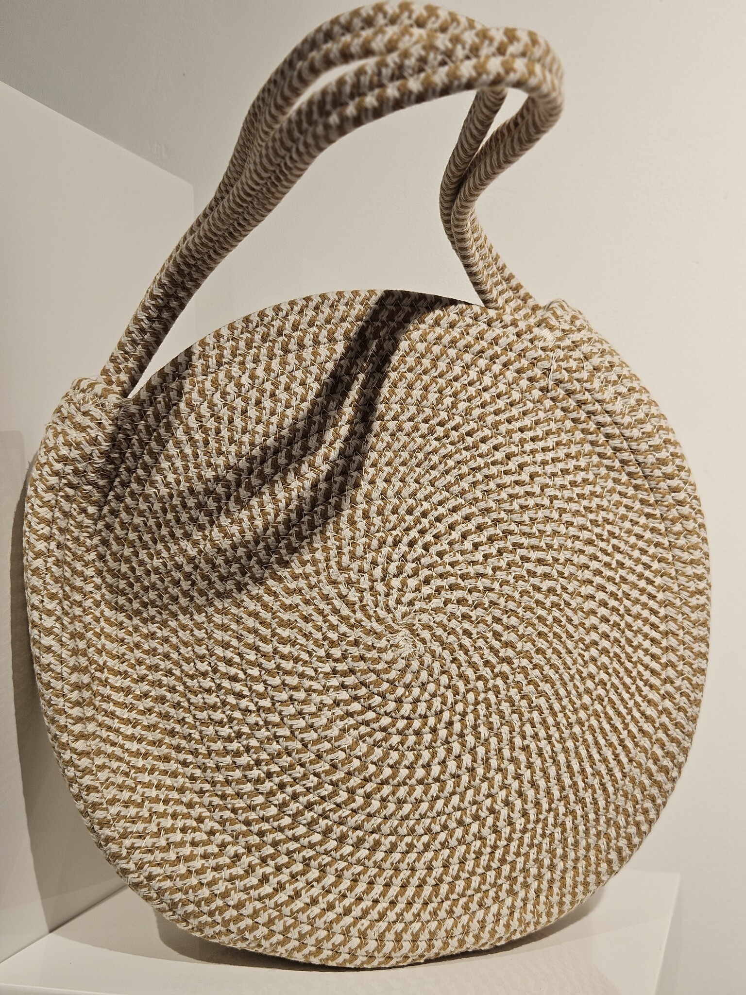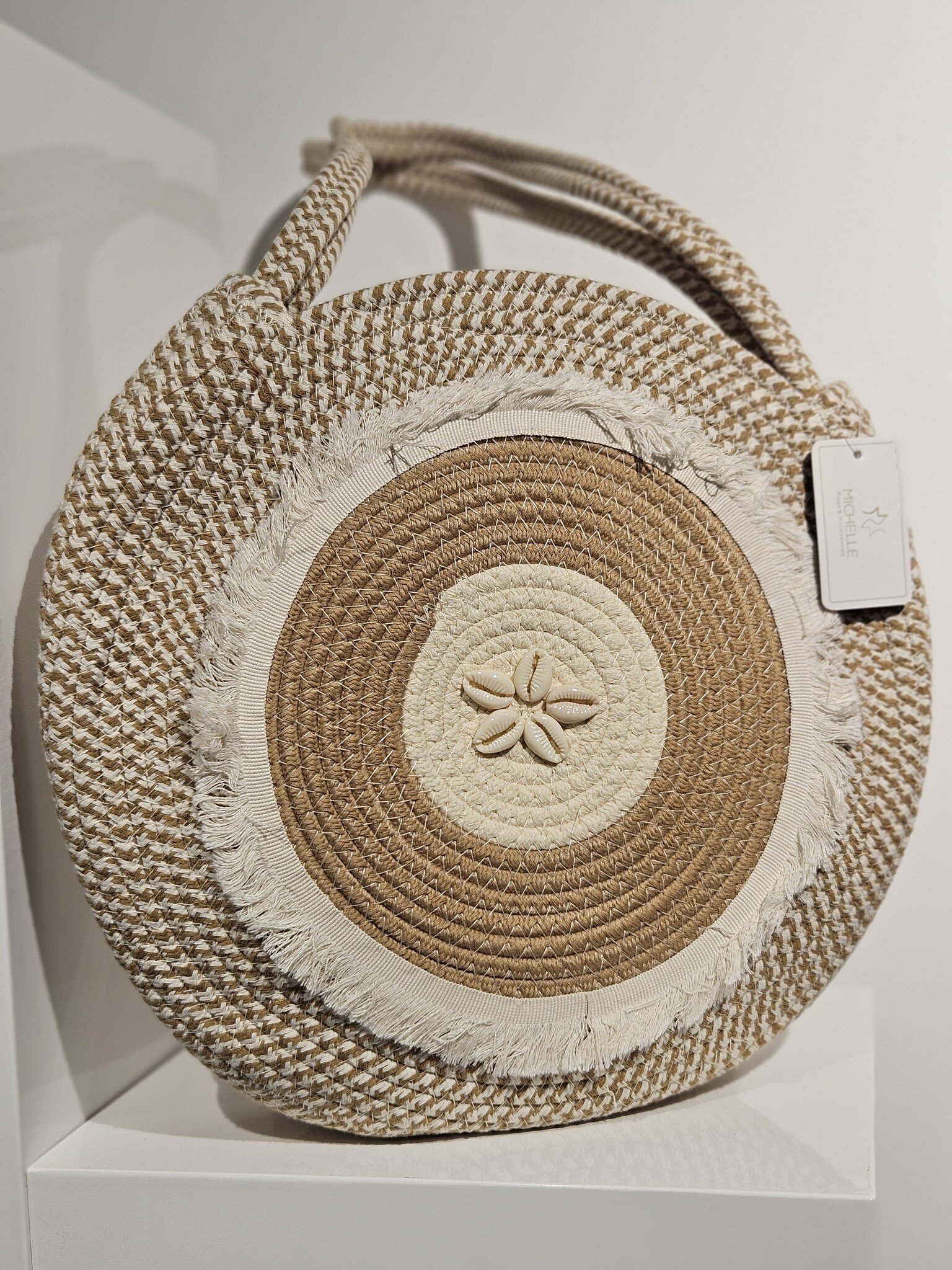 ProductomschrijvingMateriaal : touwModel : Handtas/schoudertasKleur : zand/offwhiteMerk : MichelleSluiting : ritssluitingAfmeting : 35cm (breedte) x 35cm (hoogte)