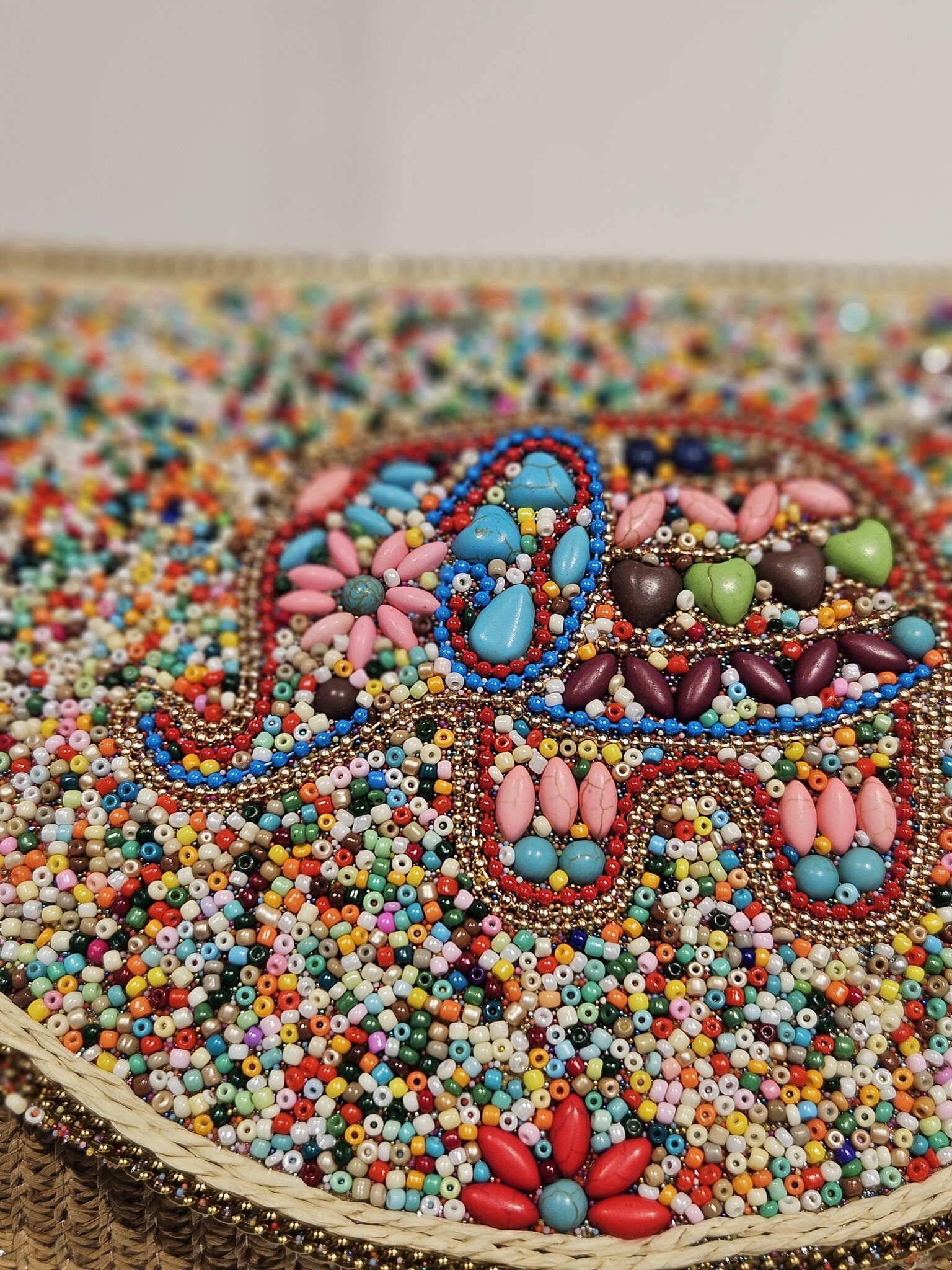 ProductomschrijvingMateriaal : kunststof/kralen mozaïekModel : schoudertasKleur : kleurenmix elephantMerk : MichelleSluiting : drukknoopsluiting Afmeting : 28cm (breedte) x 20cm (hoogte)